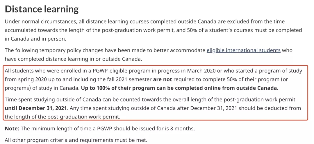 在當(dāng)時頒布的臨時條款中,曾提及直至2021年12月31日前,在加拿大境外完成的線上學(xué)習(xí),將納入畢業(yè)工簽的時長計算中。