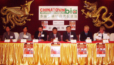 華埠商業(yè)促進(jìn)區(qū)和各界代表在記者會(huì)上宣布,第11屆中區(qū)華埠同樂日將與中秋節(jié)結(jié)合。左叁為朱偉邦,右叁為傅偉勇。