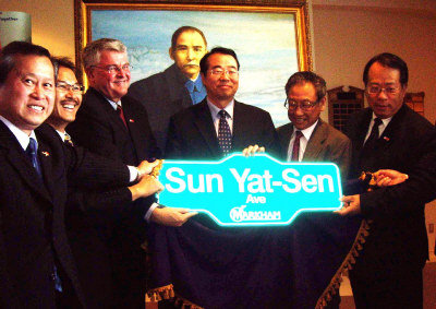由約克郡議員李國(guó)賢、萬(wàn)錦市市議員何胡景、趙善江等三人共同發(fā)起提議,11日由萬(wàn)錦市副市長(zhǎng)海斯(Jack Heath)與卡那帕西(Logan Kanapathi)以及聯(lián)邦國(guó)會(huì)議員梁中心、麥家廉、多倫多市議員李振光、列治文山市議員陳志輝、旺市議員楊士渟、中國(guó)駐多倫多總領(lǐng)事陳立鋼等多人見(jiàn)證下,與中國(guó)國(guó)務(wù)院僑務(wù)辦公室副主任許又聲共同為「中山路」舉行揭幕儀式。