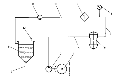 1——試驗油箱;2——吸油管;3——葉片泵;4——變速電動機;5、7——油管;;6——被試濾清器;8——壓力表;9——不銹鋼濾膜過濾器;10——回油管;11——流量計;12——通氣孔