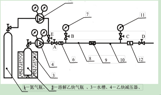 5-氮?dú)鉁p壓器、6-火焰觀測(cè)、7-乙炔壓力表、8-試驗(yàn)管路9-受檢阻火器試件、10-試驗(yàn)管路、11-乙炔壓力表、12-點(diǎn)火裝置