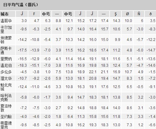 加拿大高中留學(xué)(www.llwuxin.cn/gaozhong/)專家為大家介紹下加拿大各個(gè)省的日均氣溫: