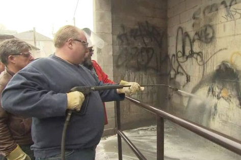 4月7日,Dufferin Street附近的St. Clair Avenue West,市長(zhǎng)福特(Rob Ford)身穿毛衣和牛仔裝,卷起袖口在街頭使用洗滌器清洗墻上的涂鴉。