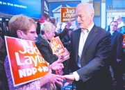 新民主黨黨領(lǐng)林頓周六到沙斯卡通(Saskatoon)競選,支持者歡迎他進(jìn)入會(huì)場?!?加新社)