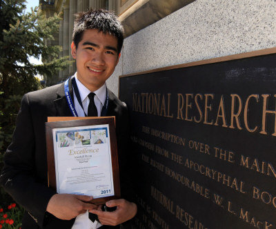 多倫多灣景中學(xué)的張同學(xué)(Marshall Zhang,音譯)參與新雞尾酒藥物療法發(fā)展工作,長遠(yuǎn)目標(biāo)是治療囊腫性纖維化癥,榮獲全國科研2011年生物天才挑戰(zhàn)獎。圖為張同學(xué)周二在渥太華領(lǐng)獎?!?加新社)