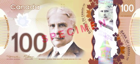 首先推出的百元鈔票上有前總理波頓(Robert Borden)的2個肖像,1個大的肖像在正面,另1個稍小的金屬色澤肖像則兩面都可看到。
