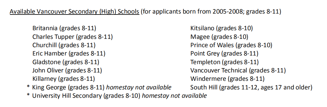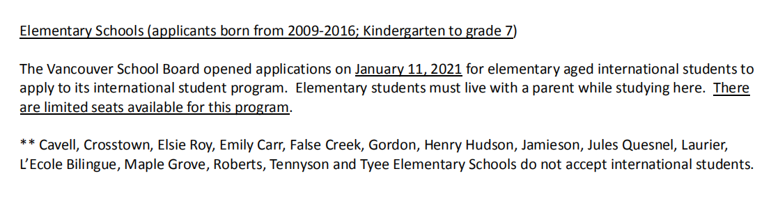 溫哥華教育局2021年9月入學位置清單: