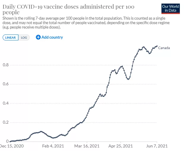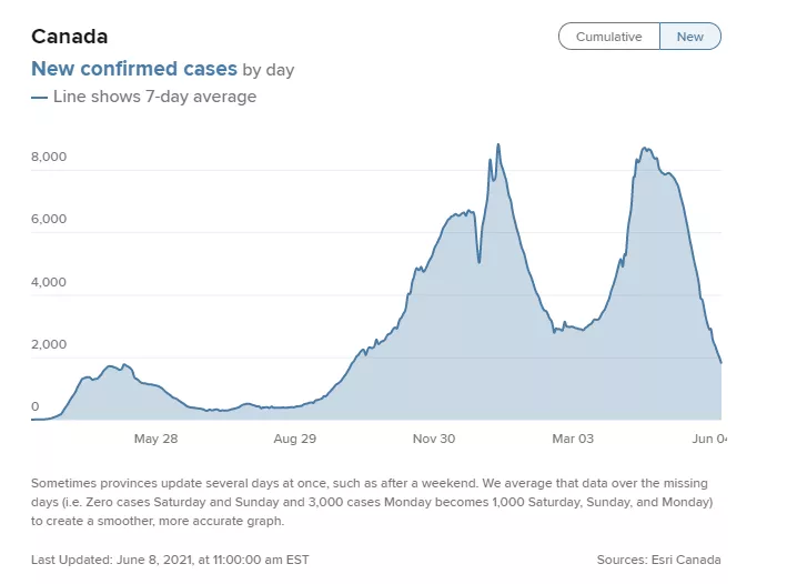 根據(jù)Our World in Data的最新數(shù)據(jù)顯示,目前加拿大第一劑疫苗接種率已經(jīng)達(dá)到64.7%,成為世界第一!加拿大的全國(guó)新增案例已經(jīng)降至2020年9月以來的最低水平,標(biāo)志著目前的疫情已經(jīng)比4月第三波高峰時(shí)驟降了近80%??偫硖佤敹嘁呀?jīng)開始計(jì)劃有階段地開放邊境,各省也紛紛推出解封計(jì)劃。