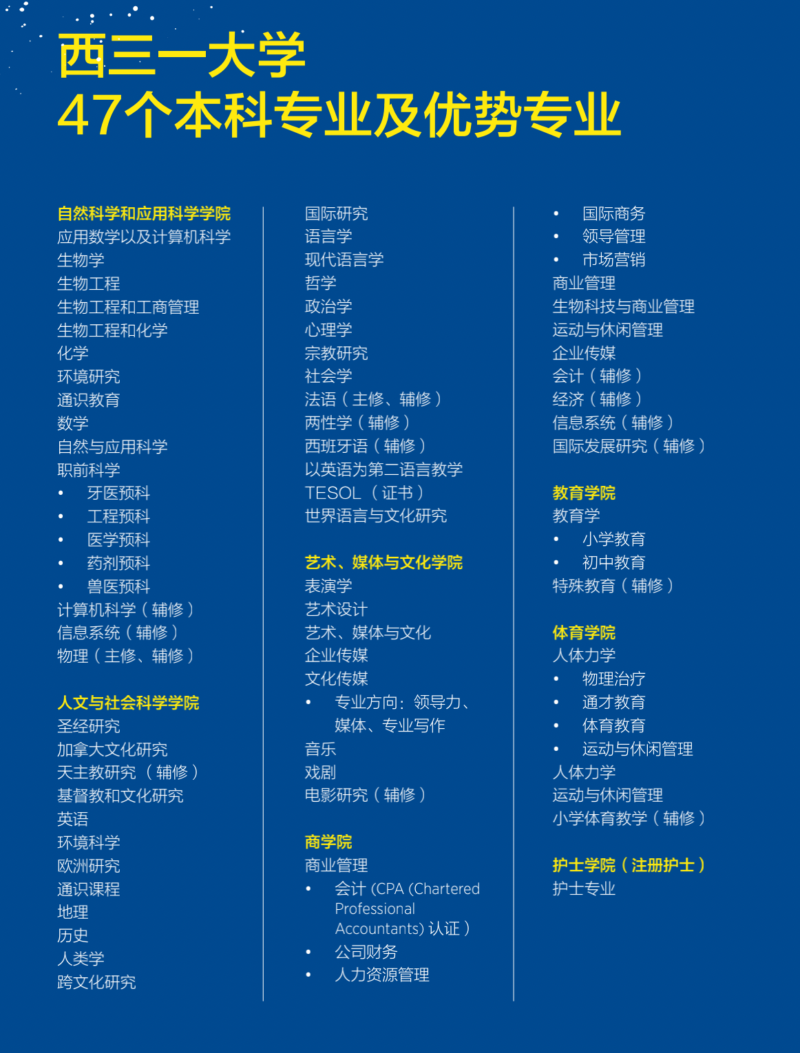 ♦ 專業(yè)設(shè)置:西三一大學(xué)有七大學(xué)院:商學(xué)院、教育學(xué)院、人類動(dòng)力學(xué)/體育及休閑管理學(xué)院、護(hù)理學(xué)院、藝術(shù)/傳媒及文化學(xué)院和理工學(xué)院,提供47個(gè)本科專業(yè)及17個(gè)碩士專業(yè),其中絕大多數(shù)均可以申請(qǐng)無語言雙錄取。