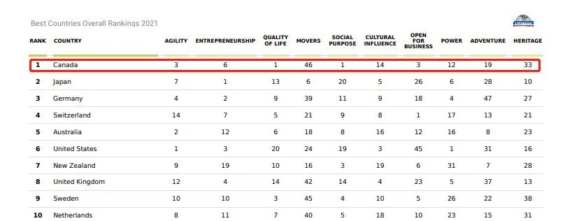 近日U.S. News發(fā)布全球最佳國(guó)家排名(Best Countries 2021),在該綜合排名中,加拿大因?yàn)樯鐣?huì)目的、女性體驗(yàn)、種族平等、發(fā)展前景、生活質(zhì)量等方面的優(yōu)秀表現(xiàn)而排在全球首位,成為全球最佳國(guó)家。