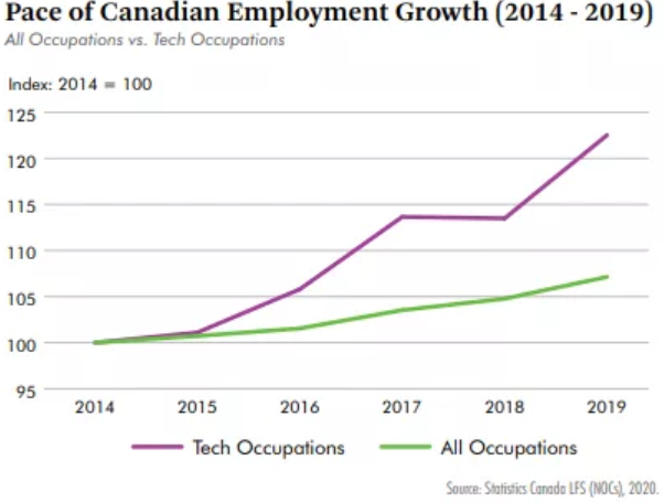 在過去的五年中,加拿大科技行業(yè)足足增加了165,300個(gè)相關(guān)崗位,增速高達(dá)22.5%,是加拿大整體就業(yè)崗位增長(zhǎng)的3倍以上。