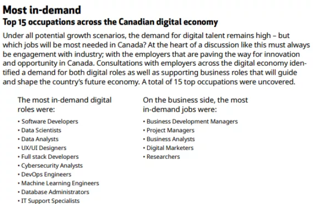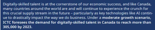 雖說崗位增速極大,加拿大勞動(dòng)力市場(chǎng)對(duì)科技人才的需求依然呈現(xiàn)供不應(yīng)求的局面。根據(jù)ICTC發(fā)布的《2023年數(shù)字人才前瞻性分析報(bào)告》顯示:隨著AI、5G、區(qū)塊連等技術(shù)的不斷發(fā)展,加拿大或?qū)⒃?023年出現(xiàn)30.5萬崗位缺口(溫和預(yù)測(cè)模式下)。
