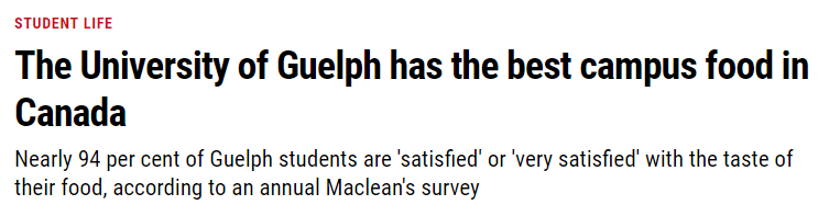 同時圭爾夫大學(xué)也可以說是加拿大留學(xué)生們的吃貨天堂,被麥考林雜志評為加拿大大學(xué)飲食第一名~在這里飲食選擇非常豐富,有17個大小食堂,各種風(fēng)格的飲食,西餐,中餐,日式,意式,印度菜,中東菜一應(yīng)俱全。學(xué)校同時還提供不同飲食習(xí)慣的選擇,比如素食,去乳糖,無麩質(zhì)食品等。