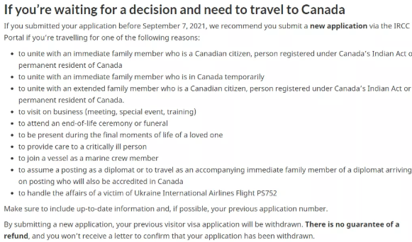根據(jù)官網(wǎng)上的信息顯示:在2021年9月7日以前申請訪客簽證(Visitor Visa)的人,需要重新提交申請,且不能保證獲得退費!