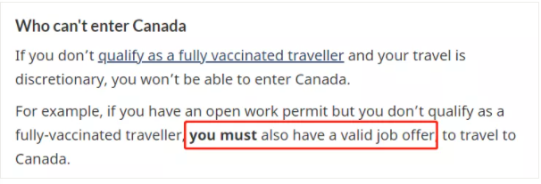 但同時移民部還在同一頁給出了一種無法入境加拿大的工簽情況:如果沒有接種加拿大認可疫苗,且旅行被認定為非必要旅行,依然無法進入加拿大。移民局給出的示例是:如果你持有開放式工作簽證,且沒有接種加拿大認可疫苗,那么你必須要有一份有效的Job offer才能進入加拿大。因此,持有開放式工簽,且沒有把握向邊境官員證明你是加拿大常住臨時居民(如有租房協(xié)議、車貸房貸等等材料),在入境加拿大前最好能夠擁有一份有效工作offer。