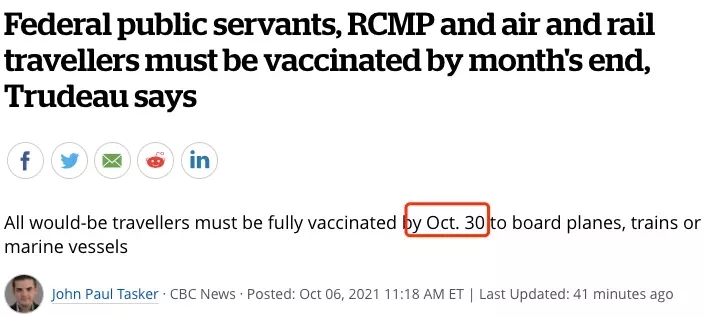 近日加拿大總理特魯多官宣了聯(lián)邦政府的強(qiáng)制性疫苗政策:在10月30日前,所有潛在旅客也必須全面接種疫苗后,然后才能登上飛機(jī)、火車或輪船;同時(shí)要求聯(lián)邦公務(wù)員月底前必須接種疫苗,否則勒令休無(wú)薪假。