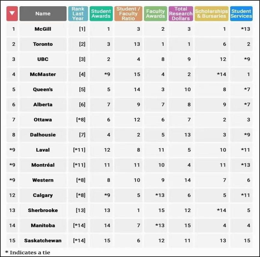 具體的評判方式,是會針對擁有全職學(xué)生1000人以上的大學(xué)進(jìn)行評分,某些宗教性質(zhì)的大學(xué)和針對性特別強的大學(xué)、新設(shè)立的大學(xué)以及非AUCC (Association of Universities and Colleges of Canada) 會員的大學(xué)均不在排名之列。