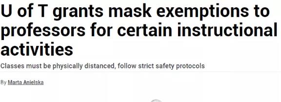 根據(jù)多倫多大學(xué)校報報道,隨著“課堂教學(xué)”的開始以及逐步推廣到大部分課程,多倫多大學(xué)已允許其學(xué)術(shù)部門向一部分教授授予教學(xué)活動的“口罩豁免權(quán)力”,只要他們遵守安全協(xié)議并能證明他們有合理的理由申請豁免權(quán)。