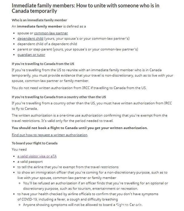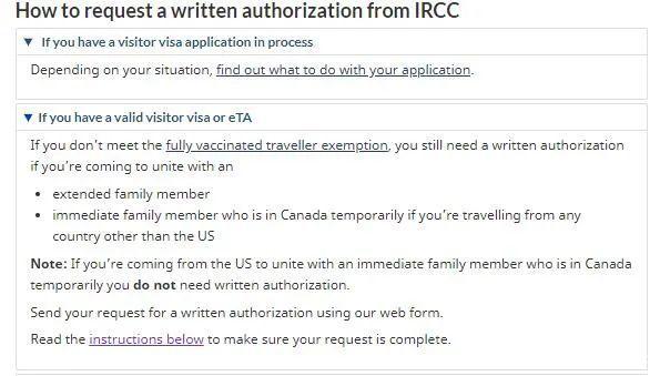 對于已經(jīng)擁有訪問簽證符合申請條件者,如果你沒有達到加拿大要求的完全接種過疫苗的旅客豁免標(biāo)準(zhǔn),如果你要和一個大家庭成員、與在加拿大以非居民身份的直系親屬從美國以外的任何國家旅行,注意:如果你從美國與加拿大非居民的直系親屬團聚,你不需要書面授權(quán)。