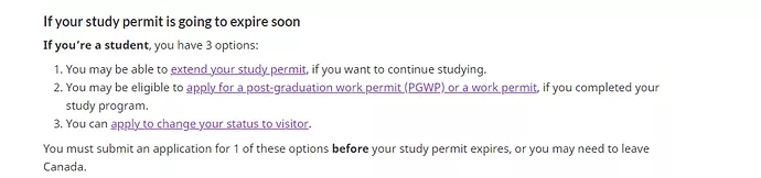 學(xué)生必須在這個期限到達前離開加拿大或者是提交其它申請繼續(xù)留在加拿大。如果學(xué)簽即將到期,目前是學(xué)生身份,一般大家有以下的選擇: