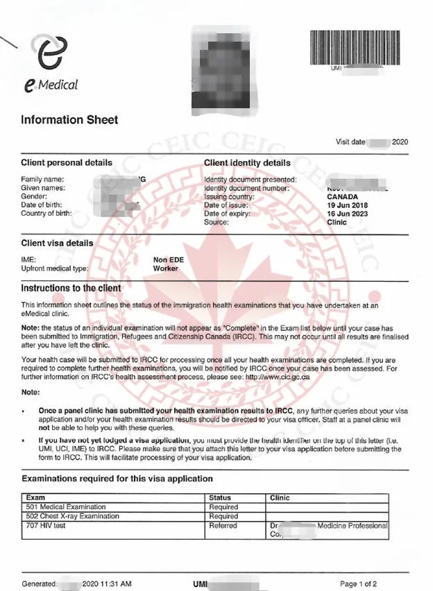 由移民局發(fā)出的體檢要求表(IMM 1017E)