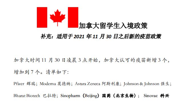 從2021年11月30日起,加拿大將擴(kuò)大其認(rèn)可的入境旅客須接種的新冠疫苗清單,其中包括中國的國藥集團(tuán)(Sinopharm)和科興(Sinovac)疫苗,與世界衛(wèi)生組織的新冠疫苗緊急使用清單相匹配。即從11月30日起,同學(xué)們只要注射完2針國藥或者科興的疫苗14天后將被加拿大視為完全免疫,將在入境的時候享受免隔離政策,同時也可以在加拿大境內(nèi)搭乘飛機(jī)和火車。