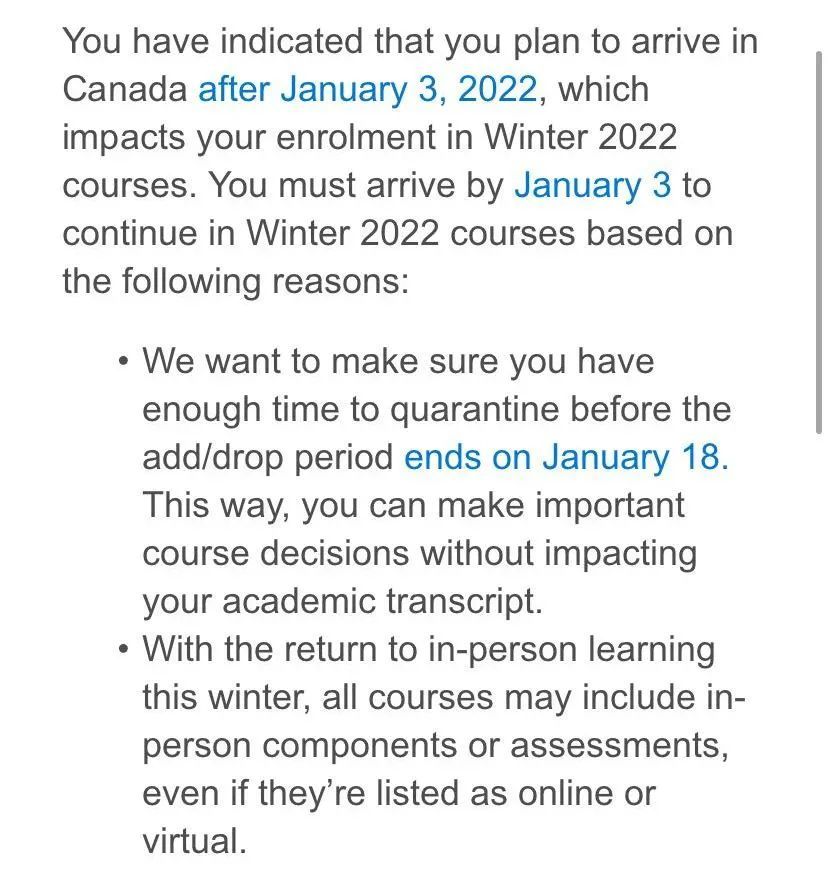 同時(shí)麥克馬斯特大學(xué)辦公室郵件也宣布到“要求所有的留學(xué)生返校時(shí)間不得晚于1月3日,否則將影響冬季課程及學(xué)業(yè)成績(jī)等。”
