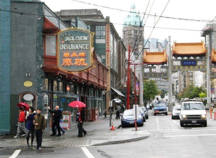 圖1:溫哥華唐人街的一個(gè)路口。圖中行人正要踏上人行橫道,這一瞬間起車(chē)輛就不能再通過(guò)了。