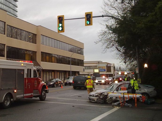 圖3:列治文街頭的一起交通事故,圖中間那輛綠色旅行車(chē)把左側(cè)這輛小轎車(chē)撞上了便道,小轎車(chē)司機(jī)已經(jīng)準(zhǔn)備上擔(dān)架了。
