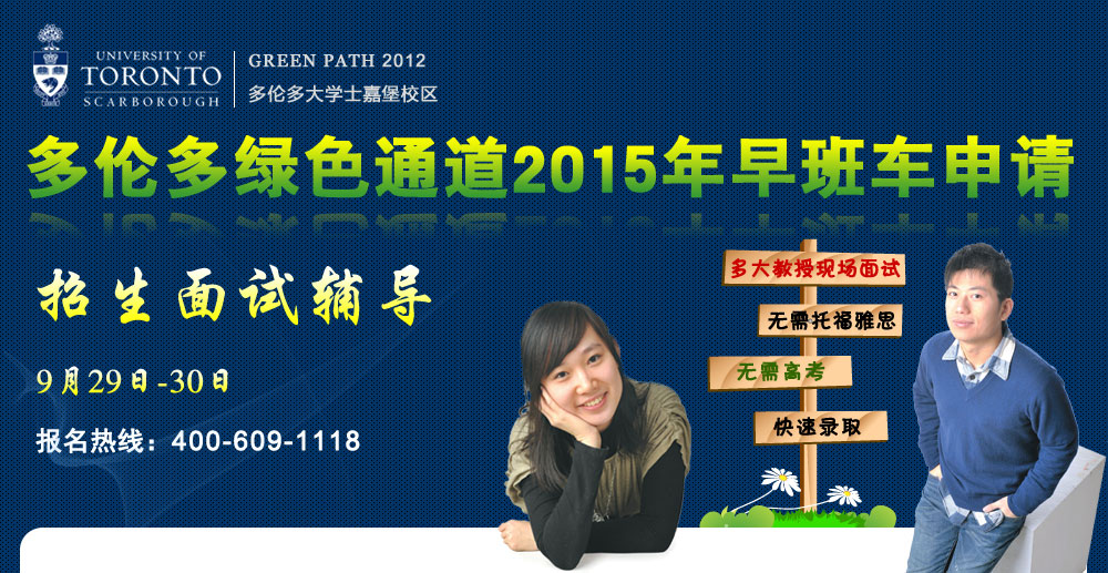 綠色通道項目是多倫多大學(xué)士嘉堡校區(qū)和中國十所頂尖高中之間的合作項目。優(yōu)秀的高中學(xué)生通過該項目直接進入多倫多大學(xué)士嘉堡校區(qū)學(xué)習(xí)。該項目由多倫多大學(xué)本科預(yù)備課程和本科課程組成。綠色通道已成功運作七年,第一屆綠色通道學(xué)生已經(jīng)畢業(yè)。他們有的進入世界一流研究生院繼續(xù)學(xué)習(xí);有的已走入工作崗位。在校的綠色通道學(xué)生因為優(yōu)異的成績和突出的學(xué)生領(lǐng)袖能力而備受多倫多大學(xué)師生的矚目..